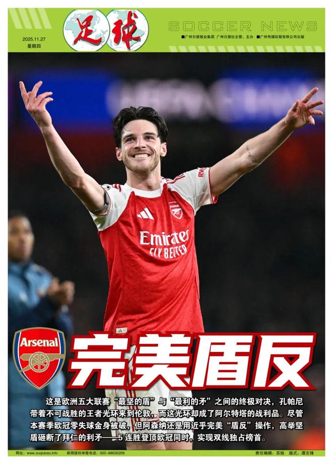 阿森纳上次输球是8月31日客场0比1利物浦,之后各项赛事16场不败。此役攻防俱佳的压倒性表现击败欧洲攻击力最强的球队,足以让人们对阿森纳的赛季目标提高期望值。欧冠5连胜仅失1球强势登顶后,最新欧冠夺冠赔率阿森纳也高居榜首(4.33),领先被击败的拜仁(6)、大巴黎(7)、曼城和皇马(9)。现在没有人怀疑,这支阿森纳有足够实力争夺英超和欧冠双冠王。